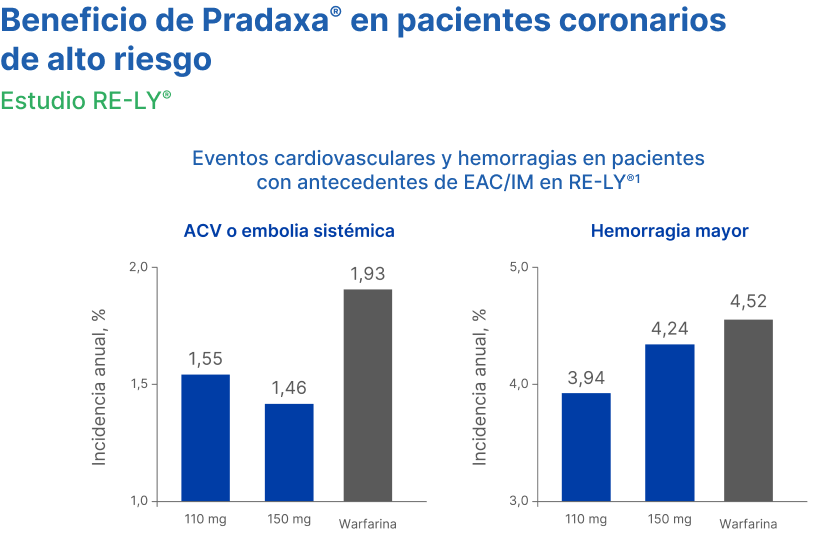 ACV, ataque cerebrovascular; EAC, enfermedad de arteria coronaria; IM, infarto de miocardio; RE-LY®, Randomized Evaluation of Long-Term Anticoagulation Therapy.