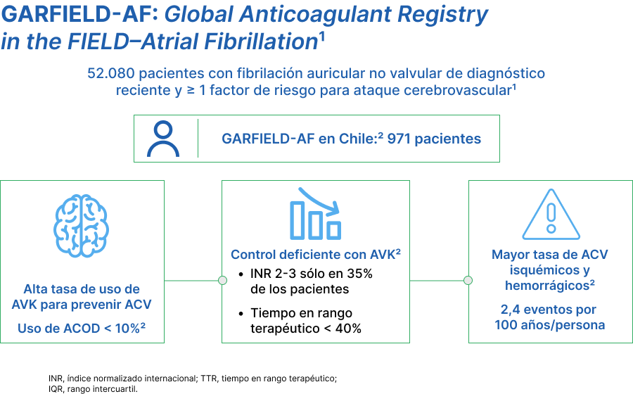 2. Corbalán R, Conejeros C, Rey C, et al. Características basales, manejo de terapias antitrombóticas y pronóstico de pacientes chilenos con FA no valvular. Lecciones del Registro GARFIELD AF en Chile. Rev Med Chil. 2017 Aug;145(8):963-971.